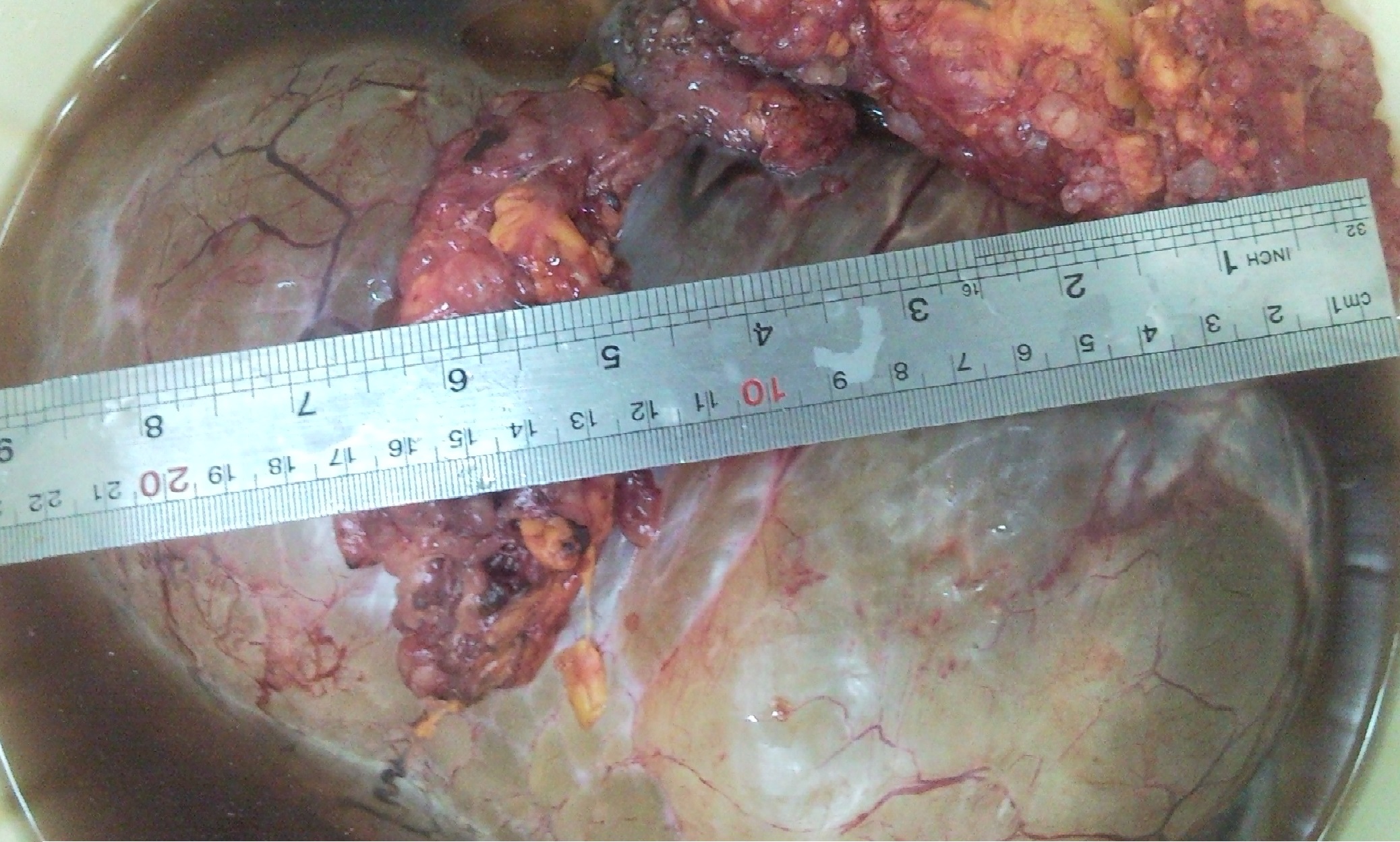یکی از دو کیست موسینوس تخمدانی خوشخیم یک خانم میانسال. وزن کیست ها 13 کیلوگرم بود! کیست های موسینوس میتوانند بسیار بزرگ بشوند.